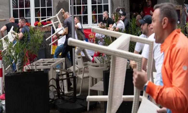 وتم استهداف عشرات المشجعين الصرب الذين كانوا يقفون خارج في شارع أرمينشتراسه في وسط جيلسنكيرشن بالمقذوفات، وفقًا لشهود عيان على أعمال العنف.