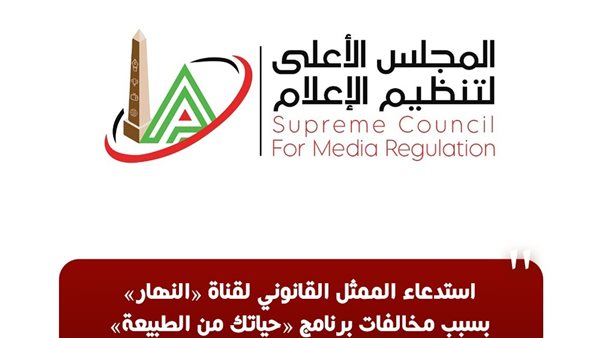 أعلن المجلس الأعلى لتنظيم الإعلام عن استدعاء الممثل القانوني لقناة «النهار» الفضائية لعقد جلسة استماع، وذلك عقب رصد مخالفات خلال بث حلقة من برنامج “حياتك من الطبيعة” بتاريخ 24 أبريل 2025. وقد جاءت الخطوة بعد تقارير الإدارة العامة للرصد الإعلامي، التي وثّقت التجاوزات المرتكبة في الحلقة محل الجدل.