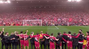 وقفت الجماهير فى الانفيلد..بينما اصطف أمامهم كل الفريق بالجهاز الفني والإداري والطبى.. الكل يشدو بأغنية النصر فى مشهد بديع غاية في الروعة والجمال والابداع والتنظيم.