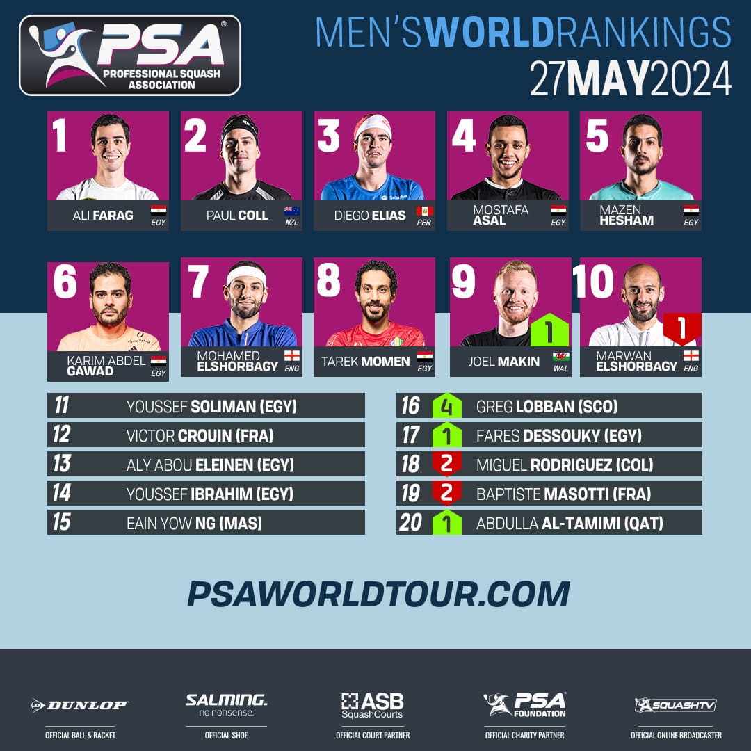 أعلنت رابطة اللاعبين المحترفين للاسكواش PSA عن التصنيف الجديد لشهر مايو الحالي، وأظهرت النتائج استمرار البطل المصري علي فرج، لاعب وادي دجلة، في صدارة التصنيف العالمي للرجال للأسبوع الـ52 على التوالي، حيث حقق رقمًا قياسيًا جديدًا بتصنيفه رقم 210 في تاريخ اللاعبين المحترفين.1ـ علي فرج