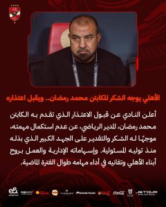 وكان الأهلي قد أعلن قبول الاعتذار الذي تقدم به محمد رمضان، المدير الرياضي للنادي، عن عدم استكمال مهمته، موجها له الشكر على الجهد الذي بذله منذ توليه المسؤولية.