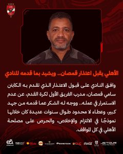 كما وافق الأهلي أيضا على قبول الاعتذار الذي تقدم به سامي قمصان، مدرب الفريق الأول لكرة القدم، عن عدم الاستمرار في عمله، ووجه له الشكر عما قدمه من جهد كبير، وفق بيان رسمي من النادي.