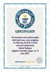 ويسعى الكابتن أشرف كابونجا، ابن محافظة الإسماعيلية، لسحب قطار السكة الحديد، والذي يزن 279 طنا من أجل كسر الرقم القياسي للماليزي الذي سحب قطارا بأسنانه وزنه 260 طن في عام 2003.