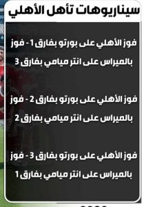 ورفع إنتر ميامي رصيده إلى 4 نقاط في المركز الثاني وبفارق الأهداف عن بالميراس البرازيلي صاحب الصدارة بنفس الرصيد من النقاط، بينما تجمد رصيد بورتو عند نقطة واحدة في المركز الثالث وبفارق الأهداف عن الأهلي صاحب المركز الرابع، ويحتاج إنتر ميامي للتعادل فقط مع بالميراس في الجولة الأخيرة ليتأهل لدور الستة عشر ونفس الأمر بالنسبة للفريق البرازيلي، بينما تأزم موقف الأهلي في التأهل عن المجموعة، حيث يحتاج الأهلي للفوز على بورتو بفارق هدفين مع خسارة إنتر ميامي أمام بالميراس بفارق هدفين.. أو فوز الأهلى على بورتو بفارق ثلاثة أهداف وفوز بالميراس على إنتر ميامى بفارق هدف.. أو فوز الأهلى على بورتو بفارق هدف وفوز بالميراس على إنتر بفارق ثلاثة أهداف.