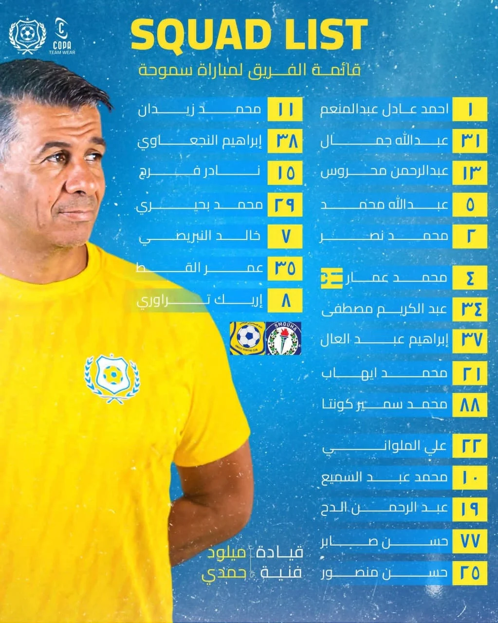 - الدفاع: عبد الله محمد، محمد نصر، محمد عمار، عبد الكريم مصطفى، محمد إيهاب.
