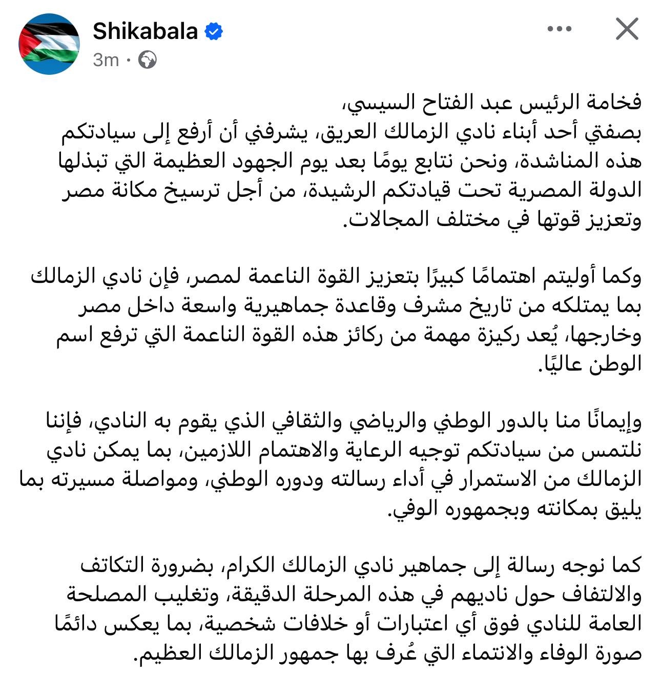 وقال شيكابالا عبر صفحته الرسمية: “بصفتي أحد أبناء نادي الزمالك العريق، يشرفني أن أرفع إلى سيادتكم هذه المناشدة، ونحن نتابع يومًا بعد يوم الجهود العظيمة التي تبذلها الدولة المصرية تحت قيادتكم الرشيدة من أجل ترسيخ مكانة مصر وتعزيز قوتها في مختلف المجالات.”