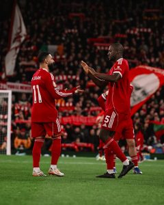 LIVERPOOL, ENGLAND – JANUARY 31: Hugo Ekitike of Liverpool celebrates scoring his team’s second goal with teammate Mohamed Salah during the Premier League match between Liverpool and Newcastle United at Anfield on January 31, 2026 in Liverpool, England. (Photo by Stu Forster/Getty Images)
