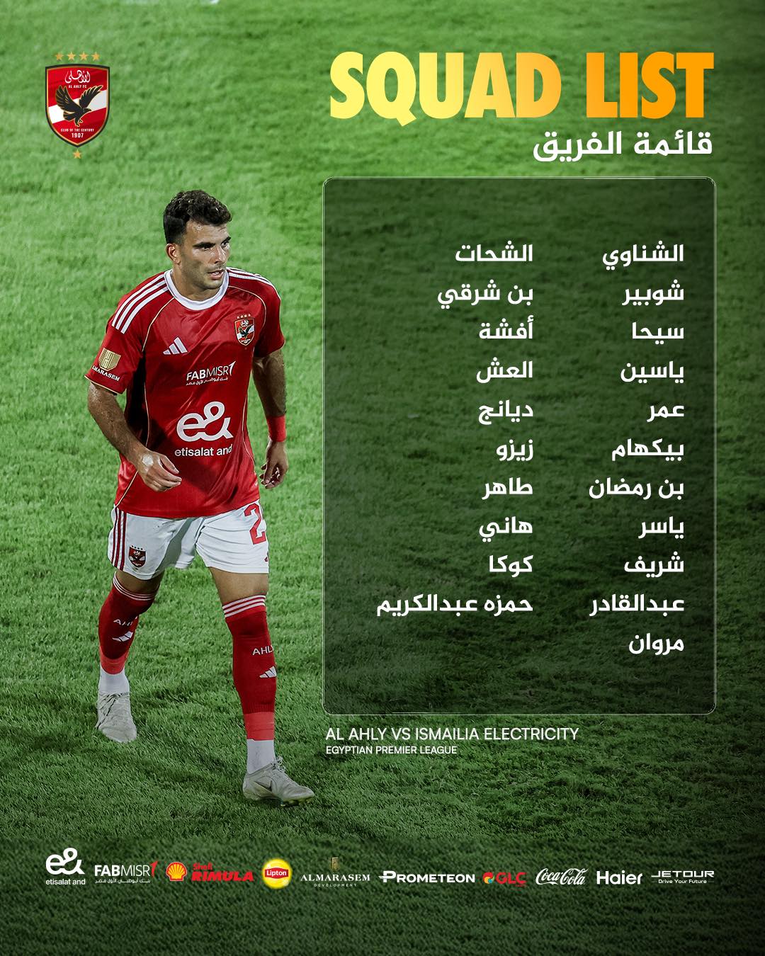 وضمت قائمة الأهلي لمواجهة كهرباء الإسماعيلية: