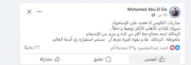 وقد نشر محمد أبو العلا تعليقه على صفحته الشخصية على موقع التواصل الاجتماعي “فيسبوك”، حيث قال: “مباريات الكؤوس لا تعتمد على الاستحواذ… مبروك للنادي الأهلي الأكثر توفيقاً وحظاً”.