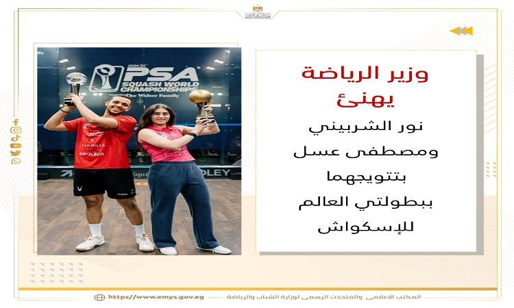 تقدم الدكتور أشرف صبحي وزير الشباب والرياضة بخالص التهاني إلى البطلة نور الشربيني والبطل مصطفى عسل بعد تتويجهما بلقبي بطولة العالم للإسكواش، والتي أقيمت بالولايات المتحدة الأمريكية.