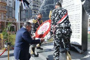 محافظ الدقهلية والقيادات الأمنية يضعان إكليل الزهور على النصب التذكاري للشهداء إحتفالًا بعيد الشرطة الـ74