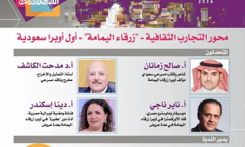يعقد معرض القاهرة الدولي للكتاب 2026، يوم الأحد المقبل، ندوة خاصة لمناقشة تجربة “أوبرا زرقاء اليمامة” بوصفها أول أوبرا سعودية، وذلك ضمن محور التجارب الثقافية.