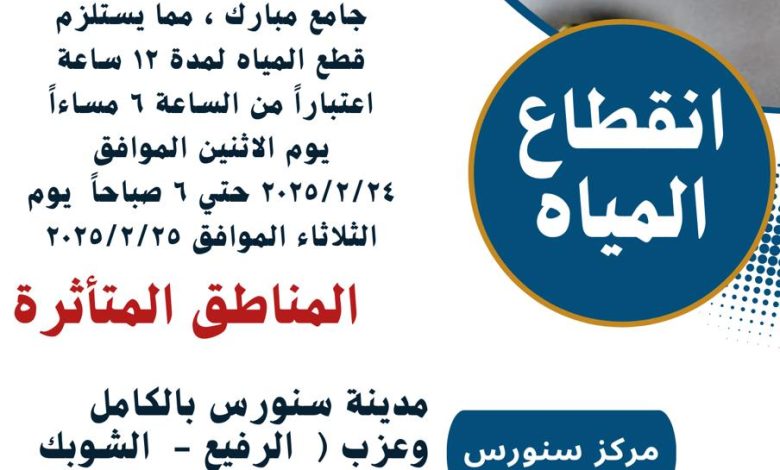 ويشمل الانقطاع المناطق التالية: مدينة سنورس بالكامل، بالإضافة إلى عزب الرفيع، الشوبك، وابهيت الحجر.