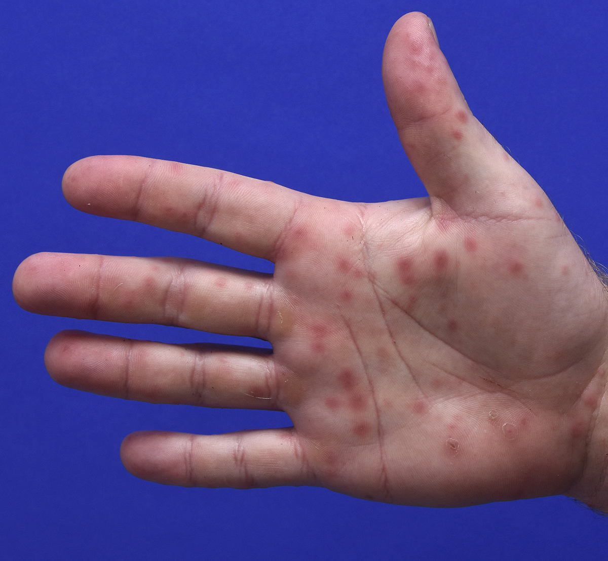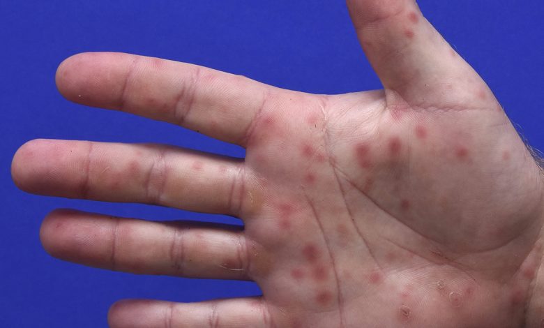 2. الأعراض اللاحقة: طفح جلدي مُثير للحكة على راحتي اليدين وباطن القدمين، تقرحات فموية مؤلمة، وتورم الغدد الليمفاوية في الرقبة.