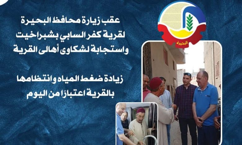 وجهت محافظ البحيرة شركة مياه الشرب والصرف الصحي بسرعة إتخاذ اللازم لحل مشكلة ضعف المياه بالقرية وخاصةً أنها تقع في نهاية خطوط الشبكة.