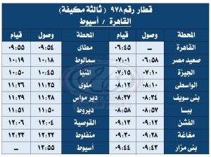 وقررت هيئة السكك الحديدية كذلك اعتبارًا من يوم السبت الموافق 1 / 11 / 2025 تقرر تعديل ميعاد قطار 930 ( ثانية فاخرة ) القاهرة / أسيوط ليقوم الساعة 06:30 بدلا من الساعة 08:30 ، مع إضافة مقرر وقوف بمحطة بنى سويف طبقاً للجدول المرفق ، بالإضافة إلى تعديل ميعاد قطار 978 ( ثالثة مكيفة ) القاهرة / أسيوط ليقوم الساعة 06:45 بدلاً من الساعة 06:30 طبقا للجدول المرفق ، ويترتب على ذلك تعديل مسير قطارى 1006 – 974 طبقاً للجداول المرفقة .