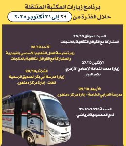 تواصل المكتبة المتنقلة جولاتها التوعوية والثقافية بمختلف مراكز محافظة البحيرة خلال الفترة من 24 حتى 31 أكتوبر 2025