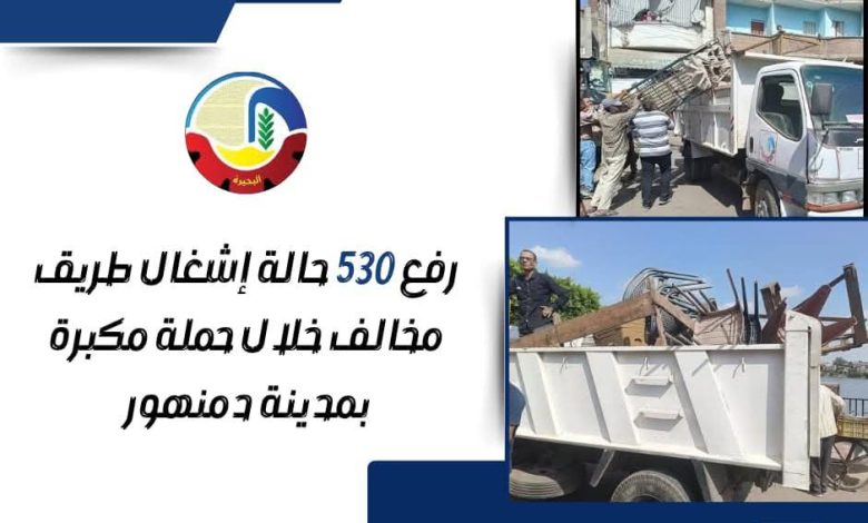 قامت الوحدة المحلية لمركز ومدينة دمنهور بتنفيذ حملة إشغالات مكبرة وذلك بالتعاون مع وحدة الإشغالات، وشرطة المرافق أسفرت عن رفع ٥٣٠ حالة إشغال طريق تنوعت مابين ثابت ومتحرك.