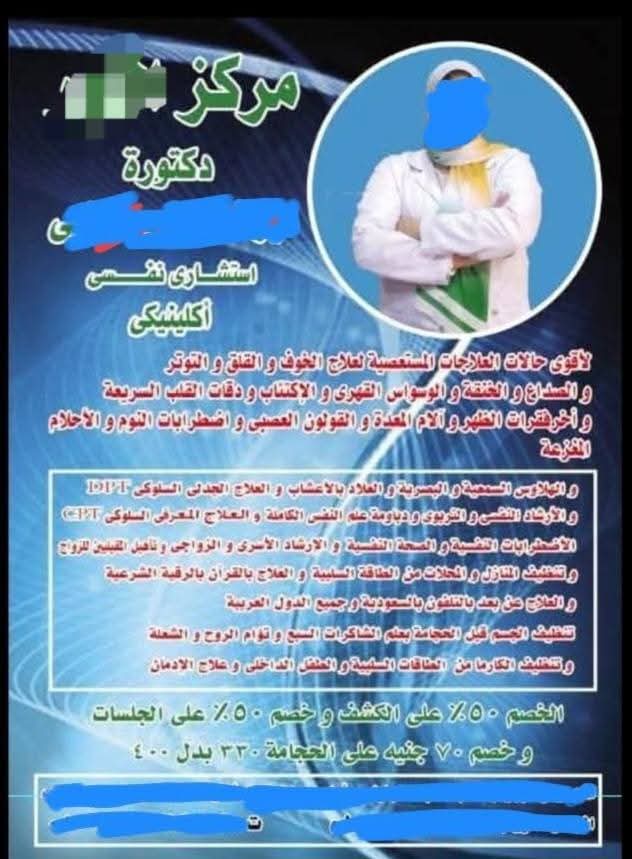 فى واقعة غريبة من نوعها إنتحلت خريجة معهد فني تجارى صفة طبيبة نفسية وظلت تمارس عملها من خلال مركز خاص يتردد عليه عشرات المرضى للعلاج يوميًا، إلى أن وردت معلومات لإدارة العلاج الحر بمديرية الصحة بالبحيرة برئاسة الدكتورة بسمة عبدالستار والتي قامت بدورها بتعقب وضبط المخالفة، وتبين ان من تنتحل صفة الطبيبة، تقوم بالإعلان عن علاج الحالات المستعصية وعلم الطاقة والحجامة وعلاج الإدمان.
