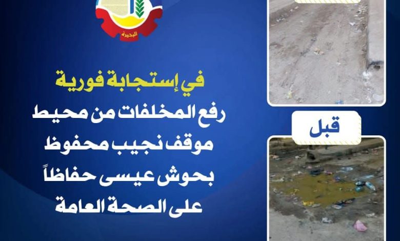 قام المكتب الإعلامي لمحافظ البحيرة على الفور بالتنسيق مع الجهات المعنية بإتخاذ الإجراءات اللازمة للتعامل مع المشكلة، في إطار الحرص على صحة وسلامة المواطنين، حيث نفذت الوحدة المحلية لمركز ومدينة حوش عيسى حملة نظافة موسعة، شملت رفع المخلفات وتطهير محيط موقف نجيب محفوظ، لضمان توفير بيئة نظيفة وآمنة لأهالي المنطقة والمارة.