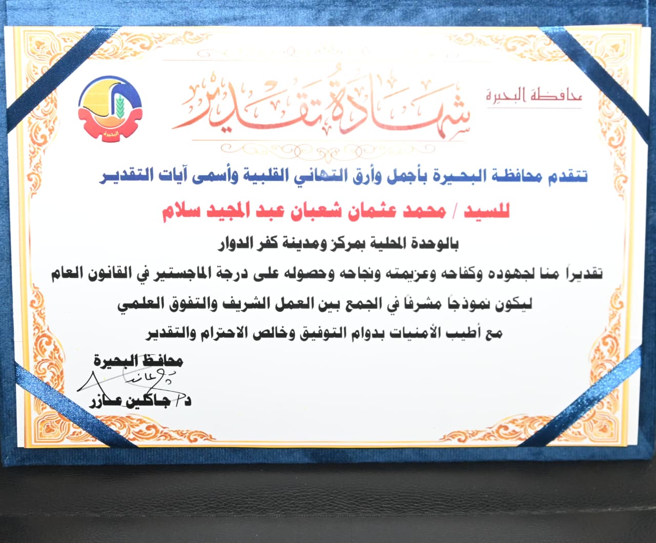 كما وجهت محافظ البحيرة بتوفيق أوضاع محمد عثمان سلام، بعمل إداري يتناسب مع مؤهلاته ومكانته العلمية، ليكون رسالة حية بأن الدولة تقدر أبناءها المخلصين وتحتفي بنجاحاتهم.