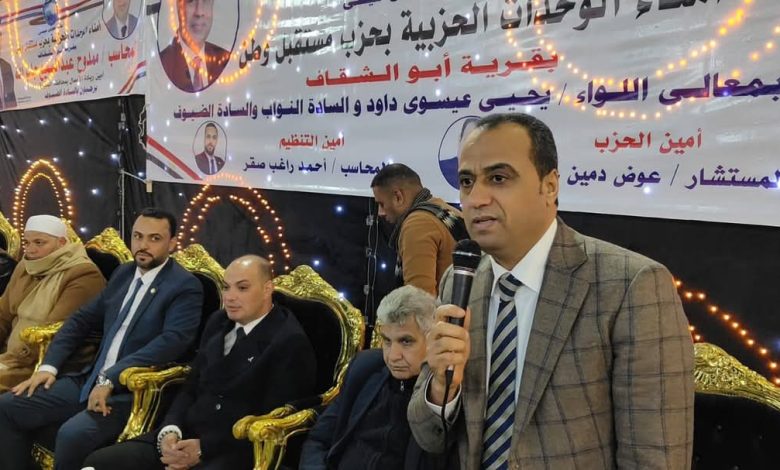 وذلك بحضور اللواء يحي عيسوى داود – الأمين العام المساعد بحزب مستقبل وطن المركزي، والنائب علاء حمدى قريطم – عضو لجنة الصناعة بمجلس النواب، والمحاسب ممدوح عبد السميع جاب الله – أمين أمانة ريادة الأعمال بالمحافظة، وعدد كبير من أمناء الأمانات النوعية، والوحدات الحزبية بمركز حوش عيسي، وذلك في مؤتمر تنظيمي كبير من أعضاء الحزب.