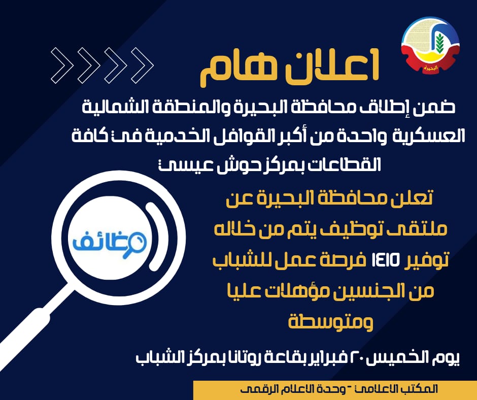 ١٤١٥ فرصة عمل للشباب .. ملتقى توظيفى بحوش عيسى الخميس القادم