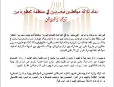 أعلنت وزارة الخارجية والهجرة وشئون المصريين بالخارج اليوم السبت عن نجاح جهودها بالتنسيق بين القطاع القنصلي بالوزارة والقنصلية المصرية في إسطنبول ، في إنقاذ ثلاثة مواطنين مصريين عالقين في جزيرة على نهر مشترك بين تركيا واليونان، وذلك بالتنسيق بين الجهات التركية المعنية حيث تم إعادتهم مرة أخرى إلى الأراضي التركية. يأتي ذلك في إطار ما تم تداوله مؤخرا على بعض…