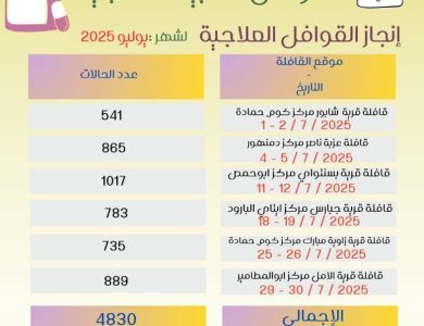 تحت رعاية الدكتورة جاكلين عازر محافظ البحيرة، وفي إطار ما توليه محافظة البحيرة من إهتمام بالغ بتكثيف عمل القوافل العلاجية والوصول بالخدمات الطبية المتكاملة والمجانية للمواطنين، خاصةً في القرى والمناطق الأكثر إحتياجاً . قامت مديرية الصحة بالبحيرة بتنفيذ سلسلة من القوافل الطبية المجانية بإجمالي عدد مستفيدين بلغ (٤٨٣٠) حالة خلال شهر يوليو فقط ، وذلك ضمن مبادرة “جايين لأهالينا” التي…