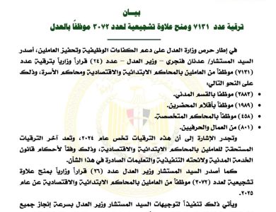 في إطار حرص وزارة العدل على دعم الكفاءات الوظيفية وتحفيز العاملين، أصدر المستشار عدنان فنجري – وزير العدل – عدد (٢٤) قراراً وزارياً بترقية عدد (٧١٣١) موظفاً من العاملين بالمحاكم الابتدائية والاقتصادية ومحاكم الأسرة، وذلك على النحو التالي: • (٣٨٨٣) موظفا بالقسم المدني. • (١٩٨٩) موظفاً بأقلام المحضرين. • (٤٥٨) موظفاً بالمحاكم المتخصصة. • (٨٠١) من العمال والحرفيين. وتجدر الإشارة…
