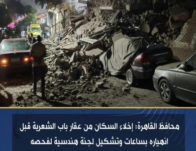 أكد محافظ القاهرة الدكتور إبراهيم صابر، أن العقار المنهار في 3 شارع محمود عبدالله من شارع الجيش بحي باب الشعرية تم إخلاؤه من السكان قبل الانهيار، ولم يسفر الحادث عن إصابات أو وفيات. وأشار محافظ القاهرة إلى أنه تم إخلاء عقارين مجاورين له احترازيًا من السكان، مع تشكيل لجنة هندسية لفحص العقار المنهار والعقارات المجاورة له لبيان مدى تأثرها من…