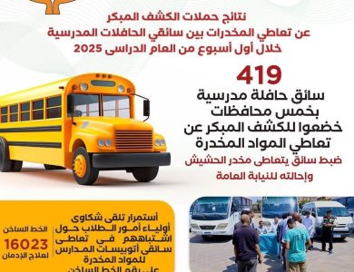 أعلن صندوق مكافحة وعلاج الإدمان والتعاطي، نتائج حملات الكشف المبكر عن تعاطي المواد المخدرة بين سائقي الحافلات المدرسية خلال الأسبوع الأول من العام الدراسي الجديد 2025 / 2026، حيث تم تنفيذ 28 حملة في خمس محافظات هي: القاهرة، الجيزة، القليوبية، الإسكندرية، والشرقية. وأوضح الصندوق – في بيان رسمي – أنه تم الكشف على 419 سائقًا، وأسفرت النتائج عن…