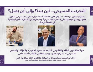 كتبت ـ نوال شلباية ينظم صالون “Artery – شريان الفن” في السابعة مساء يوم الأحد الموافق 12 أكتوبر 2025 أمسية ثقافية تجمع المبدعين والمثقفين والأدباء بمركز نوار الفني، ندوة عامة بعنوان “التجريب المسرحي أين يبدأ؟ وإلى أين يصل؟”، وذلك في إطار حرص الصالون على دعم الإبداع الأدبي وإتاحة مساحة للحوار حول التجارب الفنية والقصصية الحديثة التي تمس جوهر الإنسان وتكشف…