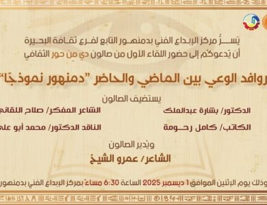 كتبت ـ ثناء القطيفى ينطلق غدًا صالون “دي من حور” الثقافي بمركز إبداع دمنهور، ضمن الجهود المبذولة لتعزيز الوعي المصري وبناء الإنسان القادر على مواجهة تحديات العصر. ويستهل الصالون جلساته الأولى بمناقشة موضوع “روافد الوعي في دمنهور بين الماضي والحاضر”، بمشاركة مجموعة من الشخصيات الثقافية والفنية البارزة. ويأتي هذا الصالون في إطار الاهتمام الوطني بتجديد آليات الخطاب الثقافي، والتركيز على…