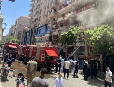 حريق ضخم داخل محل تجاري ببرج سكني في المنيا