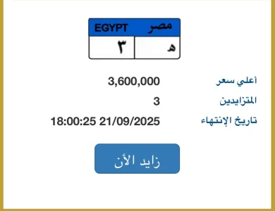 أعلنت بوابة مرور مصر الإلكترونية عن مزايدة على لوحات معدنية مميزة للسيارات، حيث وصل سعر لوحة رقم “هـ – 3” إلى 3 ملايين و600 ألف جنيه، وثلاثة أشخاص يتنافسون عليها. وتتيح البوابة لجميع المواطنين الدخول في مزاد للحصول على لوحة معدنية مميزة للسيارات من خلال عرض مجموعة من أرقام اللوحات المعدنية الخاصة بالمركبات. خطوات المشاركة في المزاد 1. الدخول على…
