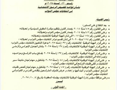 أعلنت الهيئة الوطنية للانتخابات قواعد تخصيص الرموز الانتخابية فى انتخابات مجلس النواب النواب 2025 وفقا لما جاء في الكشوف التالية وتنعقد الآن فعاليات مؤتمر الهيئة الوطنية للانتخابات، بمسرح التليفزيون المصري بمبني ماسبيرو لإعلان الجدول الإجرائي والزمني لانتخابات مجلس النواب. وعقد مجلس إدارة الهيئة الوطنية للانتخابات برئاسة القاضي حازم بدوي اجتماعا هاما صباح اليوم السبت، لمناقشة التقرير النهائي الذي…