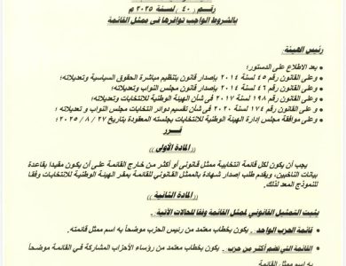 أعلنت الهيئة الوطنية للانتخابات الشروط الواجب توافرها فى ممثل القائمة بانتخابات مجلس النواب 2025 وفقا لما جاء في الكشوف التالية وتنعقد الآن فعاليات مؤتمر الهيئة الوطنية للانتخابات، بمسرح التليفزيون المصري بمبني ماسبيرو لإعلان الجدول الإجرائي والزمني لانتخابات مجلس النواب. وعقد مجلس إدارة الهيئة الوطنية للانتخابات برئاسة القاضي حازم بدوي اجتماعا هاما صباح اليوم السبت، لمناقشة التقرير النهائي الذي…