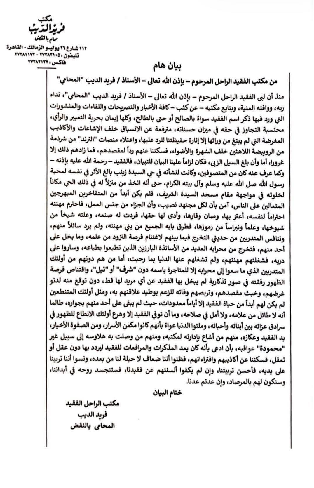 منذ أن لبي الفقيد الراحل المرحوم – بإذن الله تعالى – الأستاذ / فريد الديب “المحامي”، نداء ريه ووافته المنية، ويتابع مكتبه – عن كتب – كافة الأخبار والتصريحات واللقاءات والمنشورات التي ورد فيها ذكر اسم الفقيد سواء بالصالح أو حتى بالطالح، وكلها إيمان بحرية التعبير والرأي محتسبة التجاوز في حقه في ميزان حسناته، مترفعة عن الانسياق خلف الإشاعات والأكاذيب المغرضة التي لم يبتغ من ورائها إلا إثارة حفيظتنا للرد عليها، واعتلاء منصات “الترند” من شرذمة من الرويبضة اللاهثين خلف الشهرة والأضواء، فسكتنا عنهم رداً لمقصدهم، فما زادهم ذلك إلا غرورا، أما وأن بلغ السيل الزبى، فكان لزاماً علينا البيان للتبيان”.