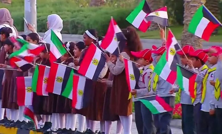 أطفال مدارس الكويت يصطفون حاملين أعلام مصر والكويت لتحية الرئيس