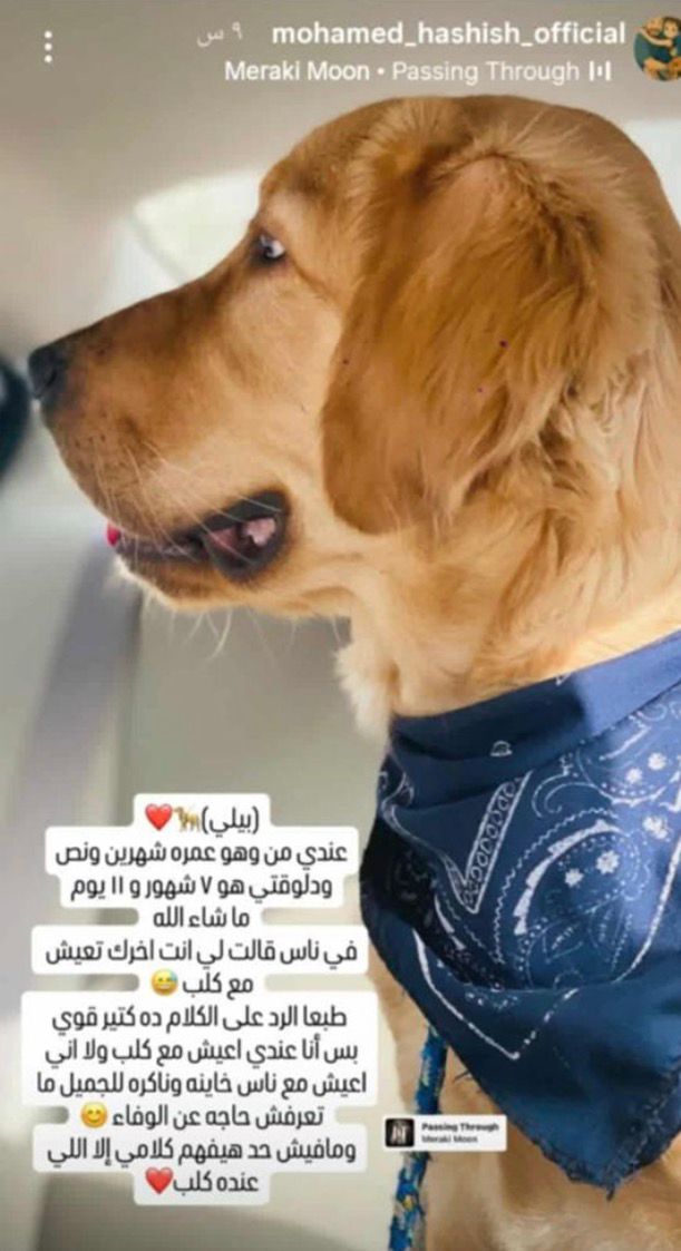 وفي أول تعليق له عبر حسابه على “إنستجرام”، كتب: “(بيلي) عنده من وأنا أعتني به منذ أن كان عمره شهرين ونصف، ودلوقتي أصبح عمره 7 شهور و11 يوم، وما شاء الله، في ناس قالت لي: أنت آخرُك تعيش مع كلب”.
