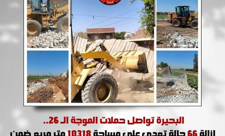وشهدت مدن ومراكز البحيرة عدة حملات موسعة أمس الأحد، أسفرت عن إزالة ٦٦ حالة تعدي على مساحة إجمالية بلغت ١٠٣١٨ متر مربع، شملت: