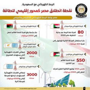 وأوضحت الإنفوجرافات أن مصر تعد بوابة الربط الكهربائي الإقليمي والدولي، من خلال الربط الكهربائي مع السودان، والذي تصل قدرته لـ 80 ميجاوات عند بداية التشغيل عام 2020، وجار استكمال المرحلة الثانية للوصول إلى قدرة 300 ميجاوات.