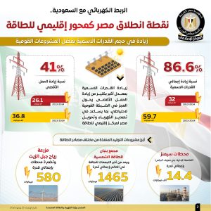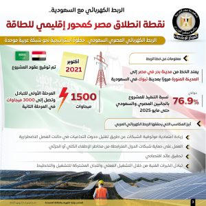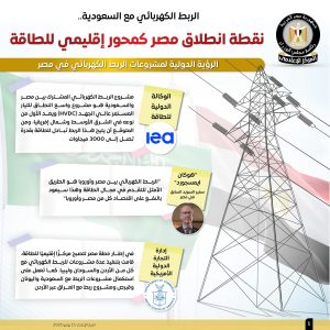 وأوضحت الإنفوجرافات أن الربط الكهربائي المصري السعودي بمثابة خطوة استراتيجية نحو شبكة عربية موحدة، حيث تم توقيع عقود المشروع في أكتوبر 2021، ليمتد من مدينة بدر في مصر إلى المدينة المنورة مرورًا بمدينة تبوك في السعودية، وقد بلغت نسبة التنفيذ للمشروع بالجانبين المصري والسعودي 76.9% حتى مايو 2025، كما تصل قدرات المرحلة الأولى للتبادل 1500 ميجاوات، أما الثانية فتصل إلى 3000 ميجاوات.
