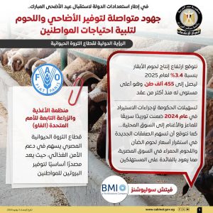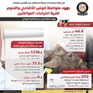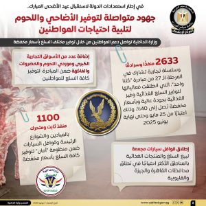 نشر المركز الإعلامي لمجلس الوزراء عددًا من الإنفوجرافات عبر منصاته الرسمية على مواقع التواصل الاجتماعي، استعرض من خلالها أبرز جهود الدولة في توفير الأضاحي واللحوم لتلبية احتياجات المواطنين، وذلك في إطار استعدادات الدولة لاستقبال عيد الأضحى المبارك.