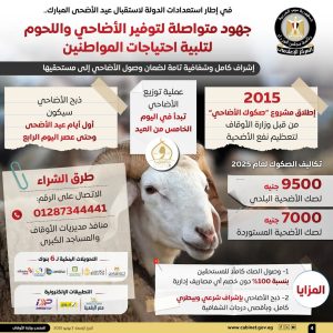 وأكدت الإنفوجرافات على وجود إشراف كامل وشفافية تامة لضمان وصول الأضاحي إلى مستحقيها، من خلال مشروع “صكوك الأضاحي” الذي أطلقته وزارة الأوقاف عام 2015، لتعظيم نفع الأضحية، وسيتم ذبح الأضاحي بدءًا من أول أيام عيد الأضحى وحتى عصر اليوم الرابع، كما ستبدأ عملية التوزيع في اليوم الخامس من العيد.