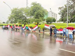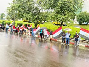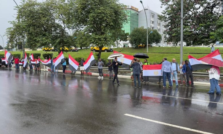 خرجت الجالية المصرية واصطفت على جانب الطريق حاملة الإعلام المصرية وهتفت بإسم الرئيس ورددت تحيا مصر.