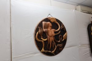 ويضم المعرض أعمال الدكتورة فاطمة معاوية، مدرس أشغال الخشب بقسم التربية الفنية، التي قدمت مجموعة من المعلقات الخشبية المتميزة تمزج بين رموز الحضارة المصرية القديمة مثل إيزيس وزهرة اللوتس وبين الرموز الشعبية المعاصرة، في رؤية فنية تعكس مضمون عنوان المعرض «وقفة بين الماضي والحاضر»، حيث تجتمع الأصالة مع المعاصرة في حوار فني راقٍ.