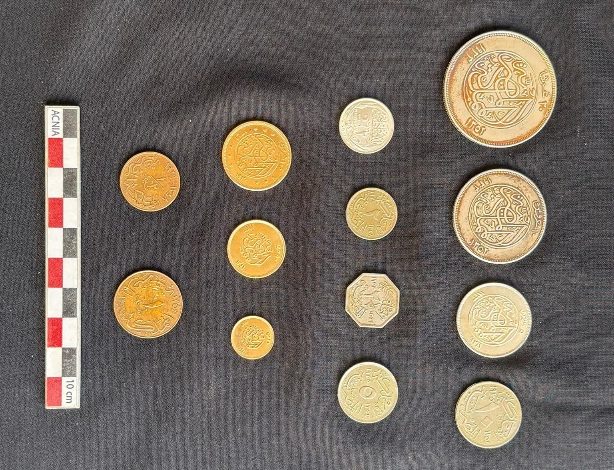 كما عثر بداخلها على ثلاث عشرة قطعة نقدية من فئات مختلفة، تراوحت ما بين المليمات والعملات الذهبية من فئة 100 قرش.