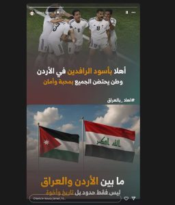 ونشر التعمري رسالة عبر حسابه على منصة “إنستغرام”، بصورة تظهر علمي العراق والأردن بجانب بعضهما، وعلق قائلا: “أهلا بمنتخب أسود الرافدين والشعب العراقي العزيز في وطننا الحبيب الأردن الذي يحتضن الجميع بمحبة وأمان ما بين الأردن والعراق ليس فقط حدود، بل تاريخ وأخوة”.